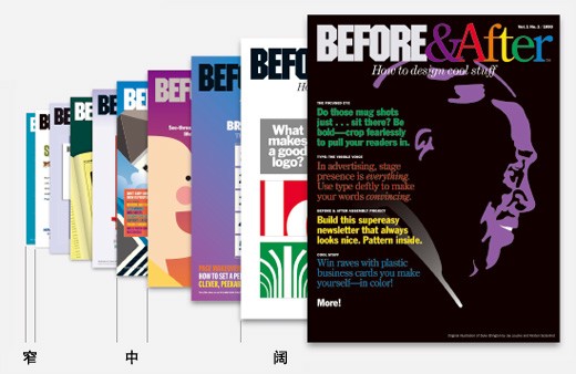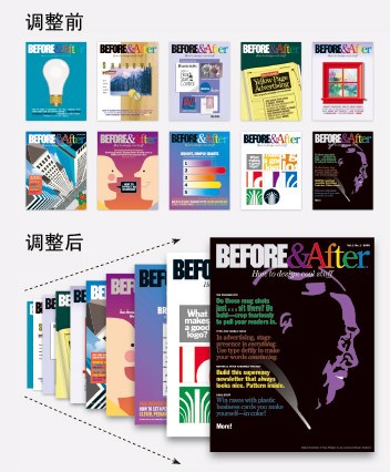 上方兩張圖,第一張可以讓讀者清晰觀看你的各期雜志封面,整齊排列就能夠很好地達(dá)到目標(biāo)。而第二張圖,通過不同的排列,我們就產(chǎn)生了一種透視感,它給人另一種不同的感覺,傳達(dá)出更多的動(dòng)感。