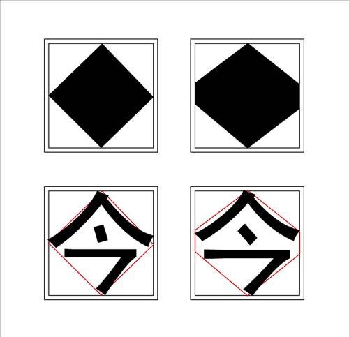 要想做大字面的字,我們首先要考慮面積最小的菱形,那么,怎樣才能把菱形字做大?很簡(jiǎn)單,只要適當(dāng)調(diào)整改變菱形的形狀,那么,我們就能得到比原來菱形面積大的形變圖形,用這種方法來設(shè)計(jì),就可以得到在視覺上比原先字面大的字。