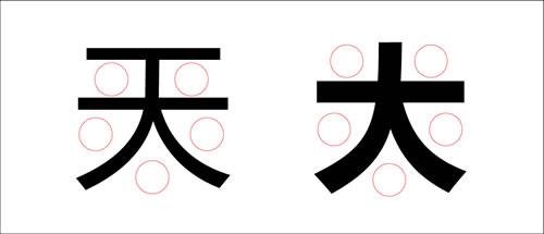 從幾何形角度來看,漢字形狀眾多,最典型的可分為四種類型:“方形、圓形、三角形和菱形”,從面積上看方形最大,菱形最小,要想把圖形面積變得一樣大小,就必須按菱形大小走,這樣設(shè)計(jì)出的漢字才能在視覺上保持一致。