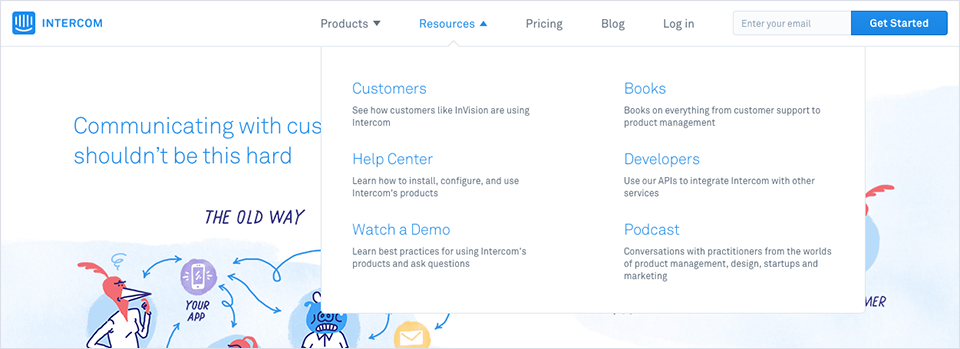 以Intercom為例,它是一款大型CRM應(yīng)用,公司旗下有三大子產(chǎn)品。官網(wǎng)首頁設(shè)置了5個一級導(dǎo)航,其中前兩個是折疊導(dǎo)航。最重要的Products導(dǎo)航的下拉菜單中按照產(chǎn)品和解決方案兩個維度展示了對應(yīng)的信息。配合icon和簡介,有序又直觀: