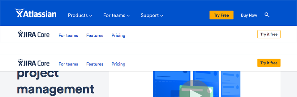 再看看Atlassian的設(shè)計(jì)。到達(dá)子產(chǎn)品頁后會保留主導(dǎo)航,隨著頁面滾動,子產(chǎn)品導(dǎo)航會把主導(dǎo)航推出,繼而代替主導(dǎo)航的位置: