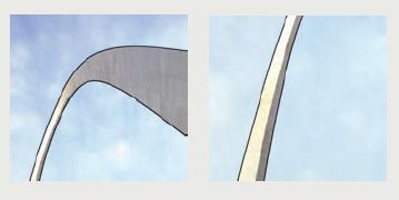 因?yàn)檫@種一線式設(shè)計(jì)對(duì)所有的細(xì)節(jié)(如顏色及圖案)都視而不見,只集中表現(xiàn)其輪廓的外觀特征,所以在上面這個(gè)拱門的建筑上,我們需要采用其上圖左拱形的部分,而不是上圖右的部分。