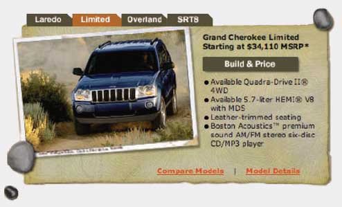 怎樣才能在這個(gè)網(wǎng)頁設(shè)計(jì)中,使吉普車的圖片讓觀看的人顯得更有動(dòng)感?簡單,在整個(gè)版面中加上一些小元素。這些小元素可以使網(wǎng)頁及圖片邊框所形成的硬邊感覺“軟化”,使到整個(gè)版面讓人覺得更加親切吸引。