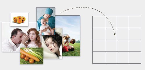 正方形網(wǎng)張:有時(shí)你在設(shè)計(jì)封面時(shí)很難找到一張完全合你心意的照片,干脆將幾張圖片同時(shí)用上。然后用方格來定位。當(dāng)然,為了使它適合網(wǎng)格的大小,你事先需要對(duì)圖片進(jìn)行適當(dāng)?shù)募羟?。一個(gè) 4 × 4 的網(wǎng)格形成 16 個(gè)小方格。注意下圖中,這些網(wǎng)格線在設(shè)計(jì)中仍然是保留的。