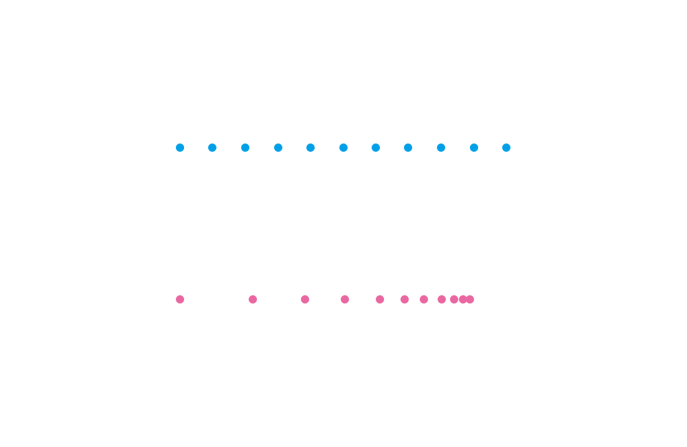 一條線也并不拘泥于就是平直的線條形式,只要能連綴成串的,我們都可以把它看成一條線,它就能在構(gòu)成中發(fā)揮起線的作用。藍色的圓點均勻分布,組成一條非常平靜的運行軌跡線,紅色的圓點具有漸變的節(jié)奏,它們組成的線條則帶著幾分變速之感。