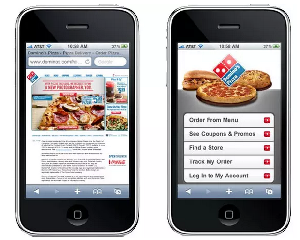 相比在移動(dòng)端上直接操作桌面版網(wǎng)頁(yè),經(jīng)過適配的移動(dòng)網(wǎng)頁(yè)會(huì)大大方便用戶的操作使用。舉個(gè)例子,下圖是手機(jī)端  Domino 披薩官網(wǎng)的兩個(gè)版本,一個(gè)是桌面版網(wǎng)頁(yè),另一個(gè)是已適配手機(jī)端的網(wǎng)頁(yè)。