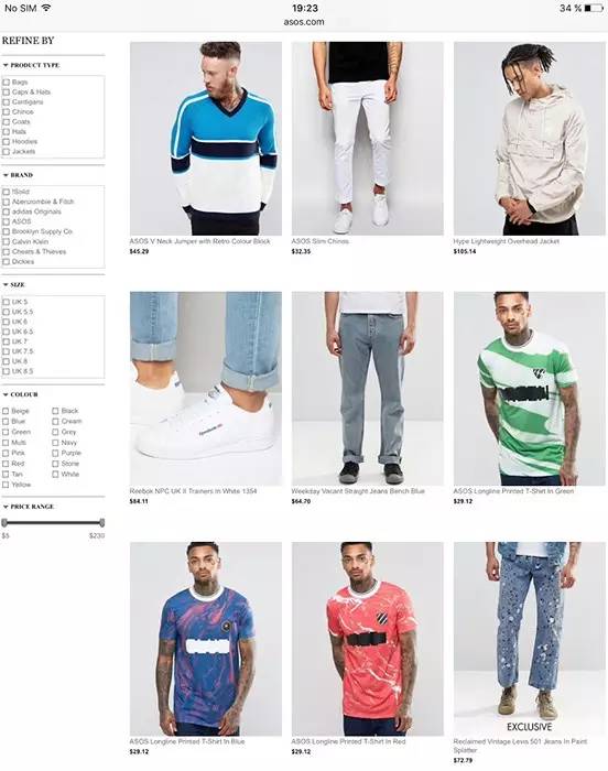 ASOS 使用了合適的照片尺寸,但字體卻不夠大。在小而亮的屏幕中看這些小字體實(shí)在是會(huì)令用戶頭疼:
