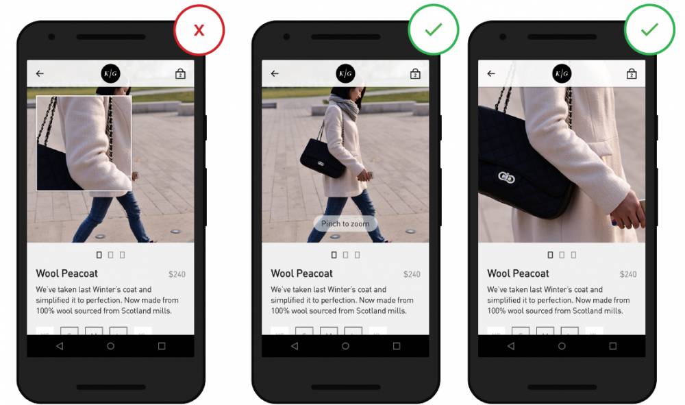 用戶要可通過雙擊圖片或點(diǎn)擊圖片變焦按鈕,輕松地放大商品照片來(lái)查看更多的細(xì)節(jié)。此外,圖片放大的部分也應(yīng)該是高分辨率的。