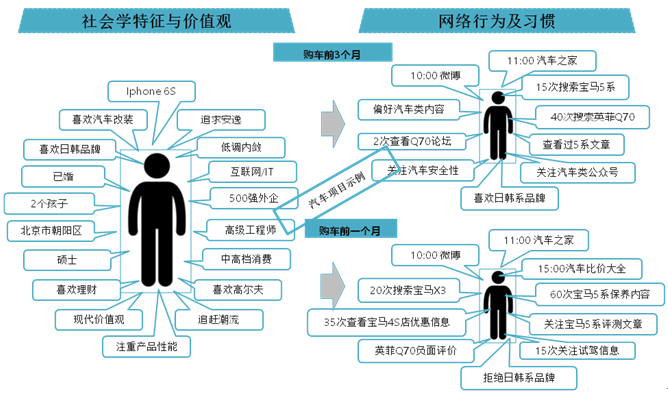 用戶畫像到底可以做到多精準?下圖以一個汽車用戶為例,用戶的所有社交行為都被分析出來,你可以了解到該用戶近期有購車需求,以及他的消費能力、對汽車車型、性能及價位的偏好等,在此基礎上才能做出更高效的用戶轉化方案。試想一下,如果對一個完全沒有購車需求,或者關注價位比較低的用戶去推送中高端汽車,肯定產生不了轉化。
