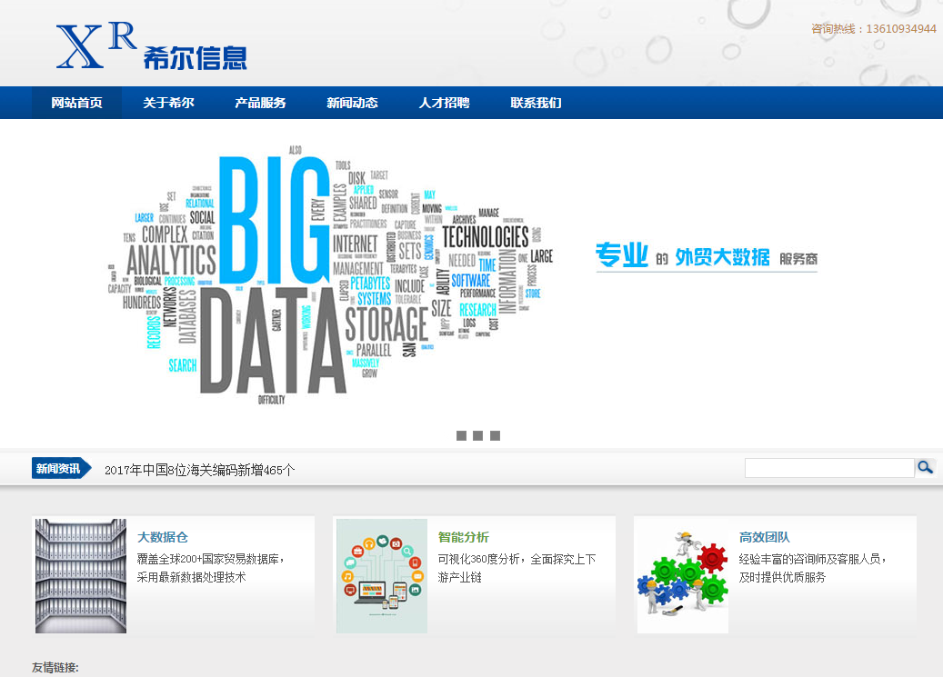 作為專注于貿(mào)易資訊的服務(wù)商,公司向進(jìn)出口企業(yè)提供準(zhǔn)確、完整的交易數(shù)據(jù),為外貿(mào)企業(yè)深入研究市場(chǎng)提供情報(bào)保障。公司擁有專業(yè)的數(shù)據(jù)處理團(tuán)隊(duì)和一批有豐富營(yíng)銷經(jīng)驗(yàn)的情報(bào)咨詢師。目前涉及醫(yī)藥化工、電子電器、機(jī)械重工等幾十個(gè)領(lǐng)域。精誠(chéng)所至金石為開(kāi),希爾愿為中國(guó)大數(shù)據(jù)事業(yè)的發(fā)展,貢獻(xiàn)全力!